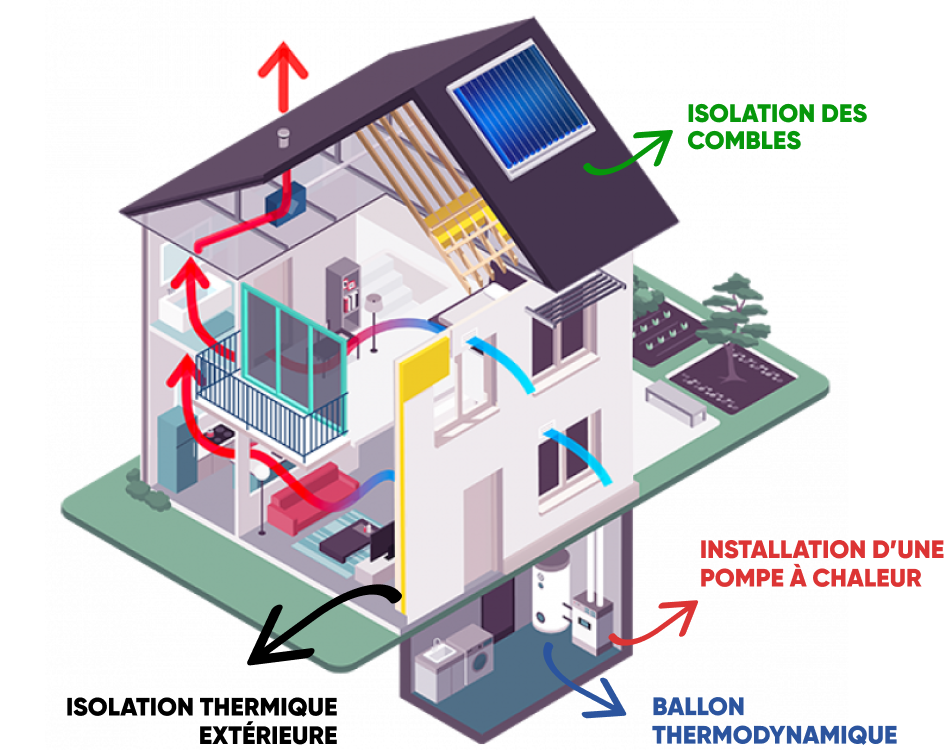 Bénéficiez d’une isolation thermique extérieure, d’un chauffage par Pompe à Chaleur, et d’une production d’eau chaude par un ballon thermodynamique.